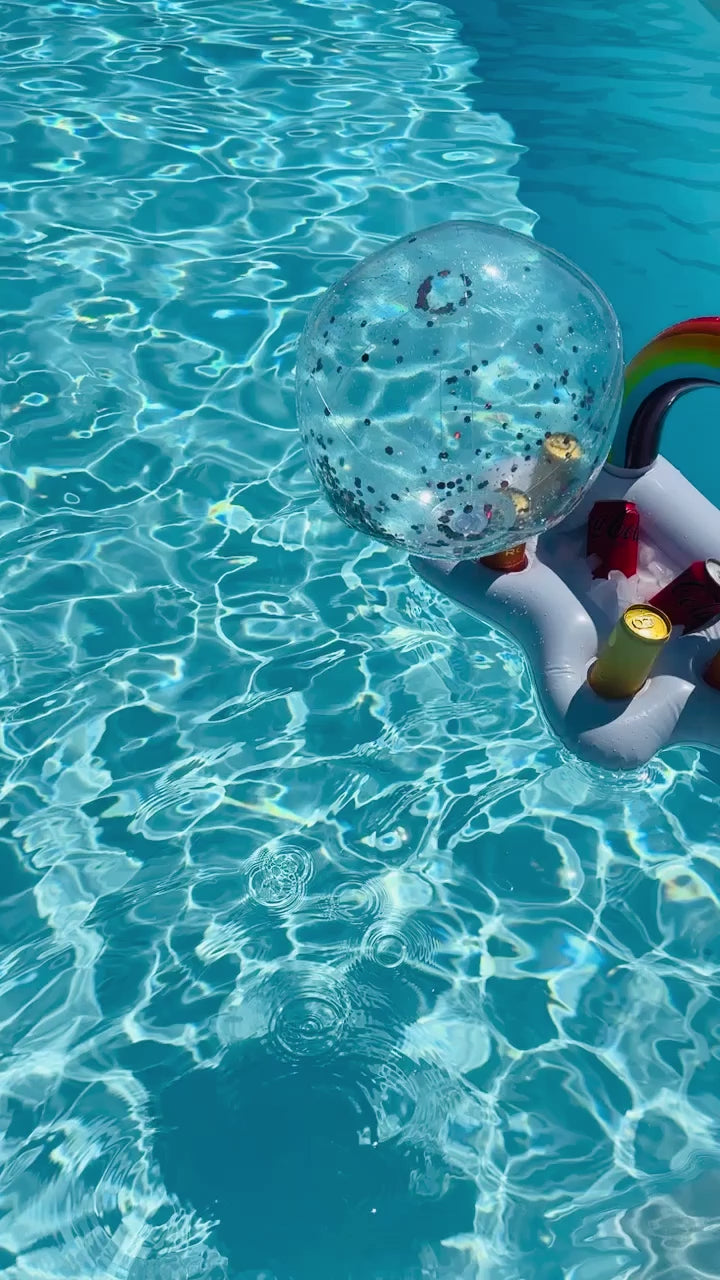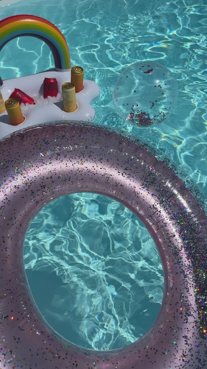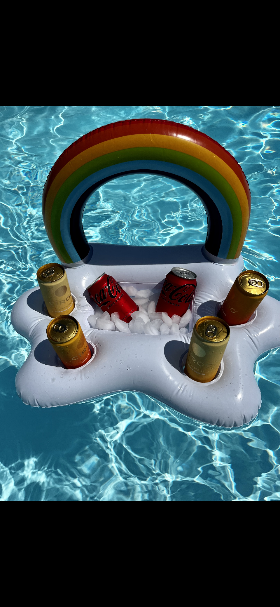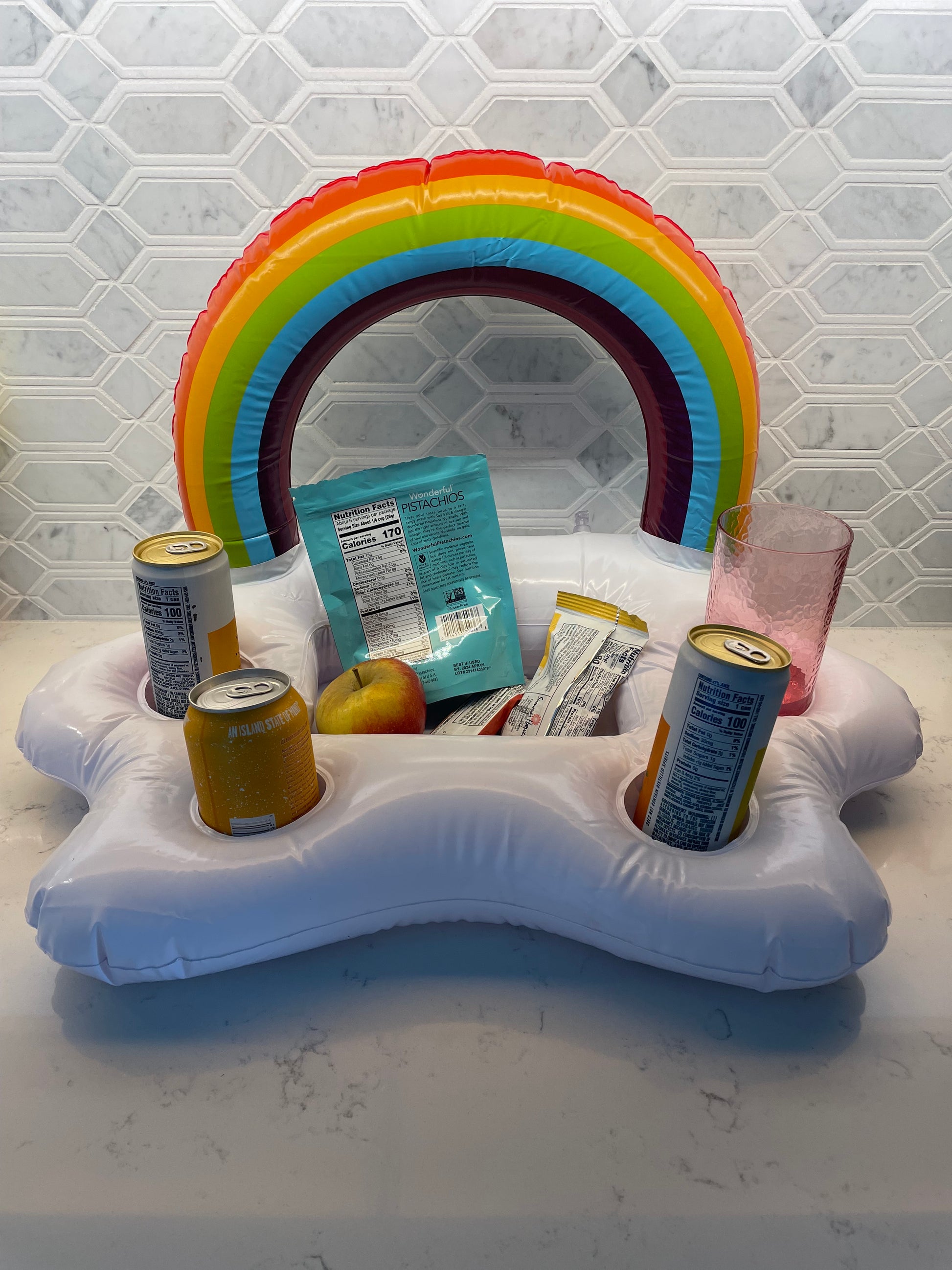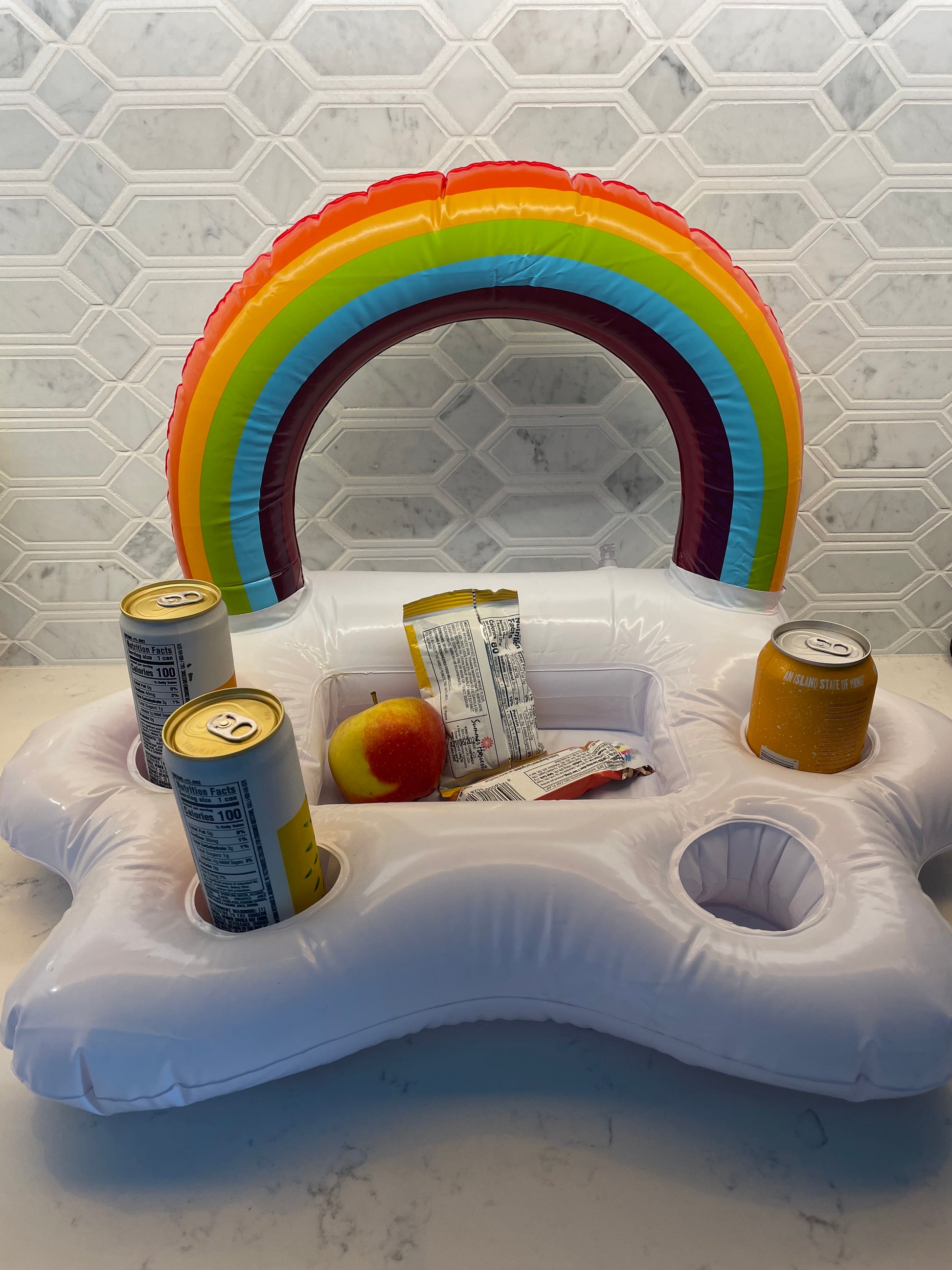 FUN TIMES!! Get the party started with this beautiful rainbow food and beverage water float! Easily accommodates 4 cans/cups, and multiple snacks in the middle. Float around with your friends and not worry about holding onto your drink! Inflates in no time and measures about 23 inches x 15 inches x 14 inches tall. Food and drinks not included. Rainbow themed pool parties... add the unicorn rainbow drink holder, the rainbow unicorn 3D ball, and the rainbow unicorn glitter swim ring!